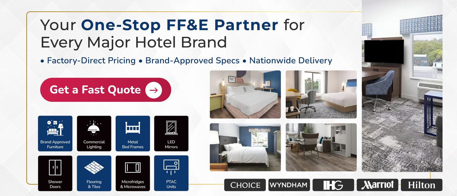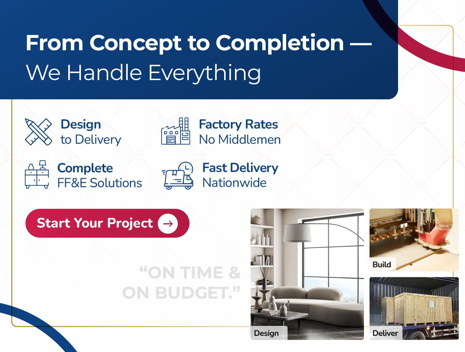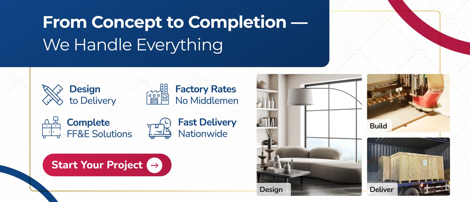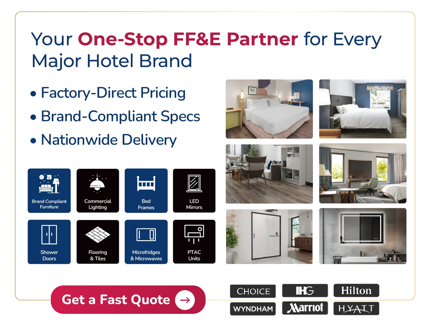 Every project is different. We customize FF&E packages for boutique hotels through large-scale 500+ room properties, meeting brand specs and staying within budget
