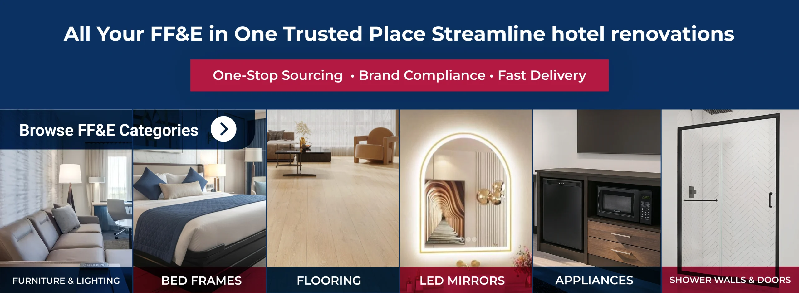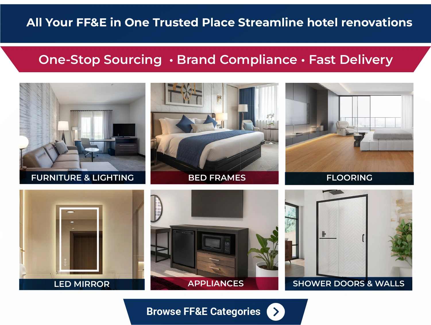 Deep expertise as a hospitality products supplier in meeting Hilton, Marriott, and IHG renovation guidelines to guarantee brand-approved products and processes