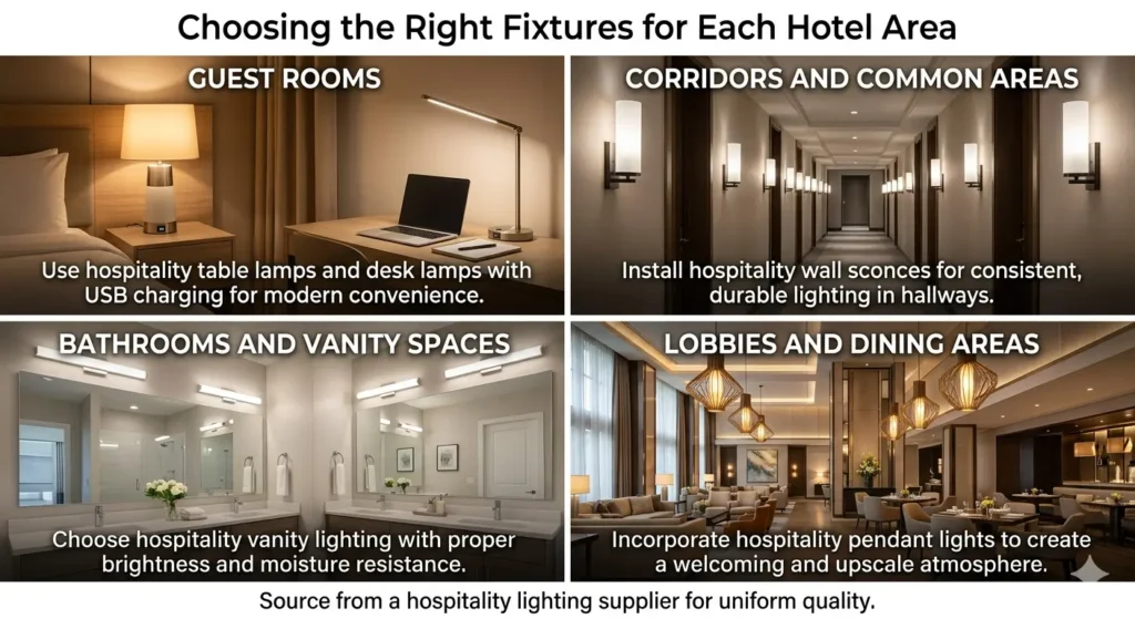 Different areas of a hotel require specific types of commercial hotel lighting. A well-planned lighting strategy improves both guest satisfaction and operational efficiency.