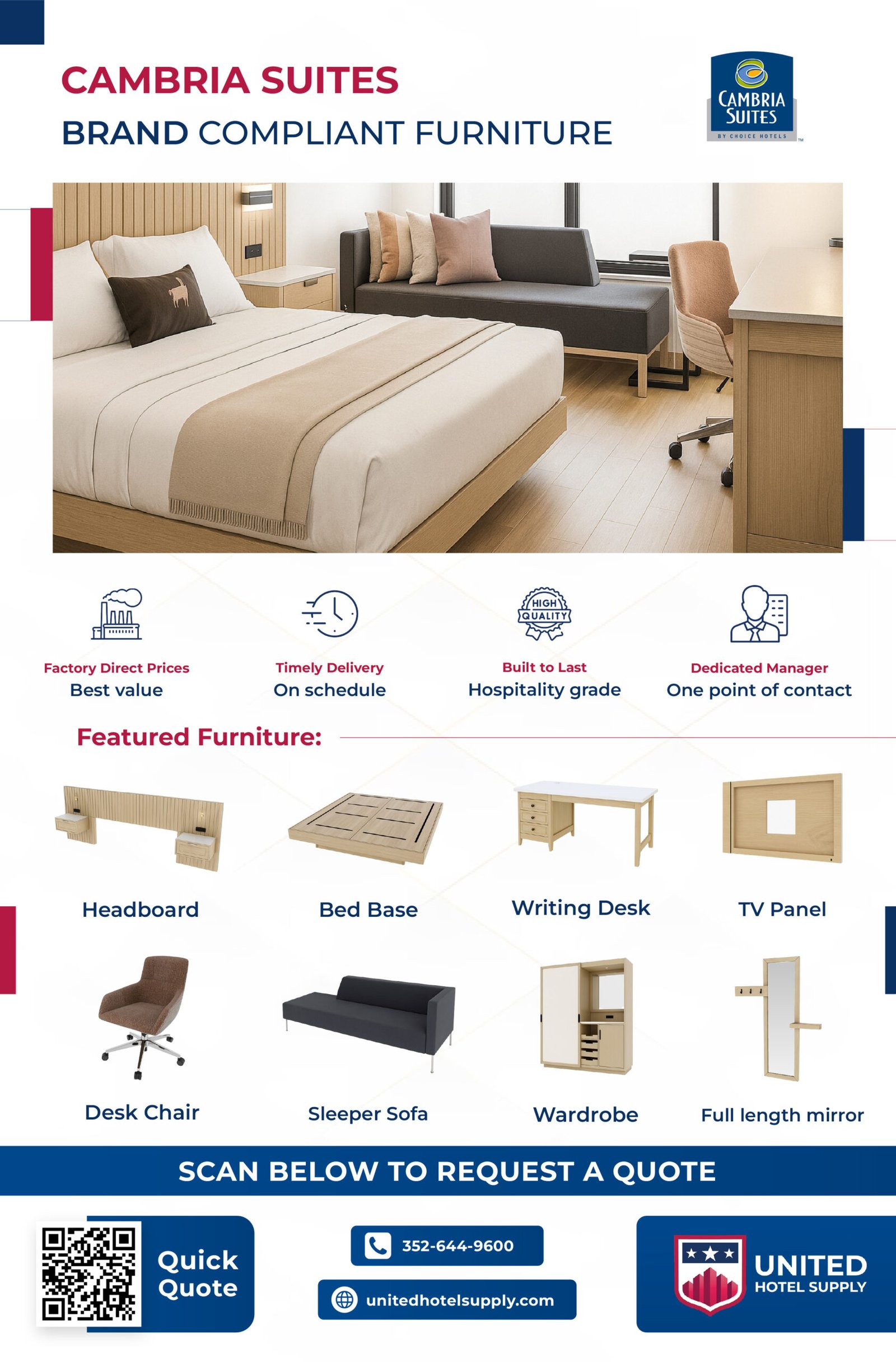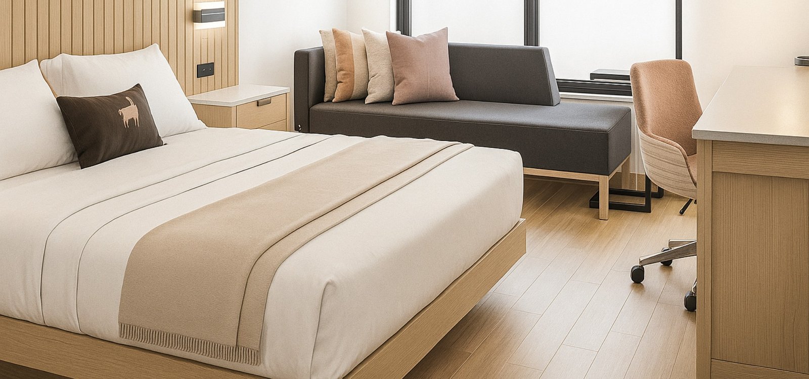 Carefully chosen to meet the needs of today’s extended-stay guests, the Cambria Suites furniture line blends durability, functionality, and comfort with a clean, modern style designed to elevate any suite.