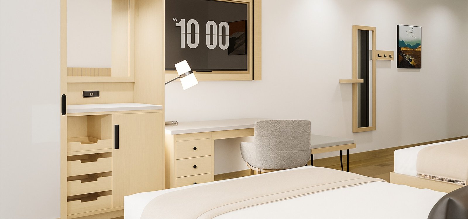The wardrobe balances generous storage space with sleek design, making room for guest belongings while maintaining the clean, inviting look of the suite overall.