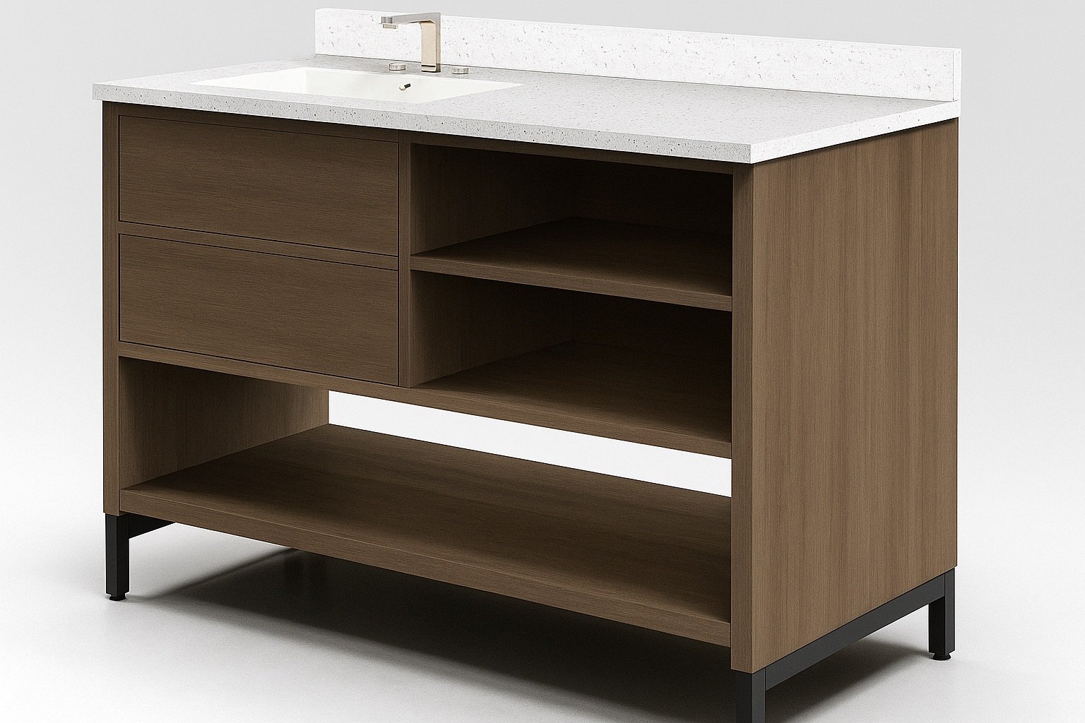 Featuring sleek surfaces and efficient storage, the vanity balances practical elegance with the ease of daily routines.