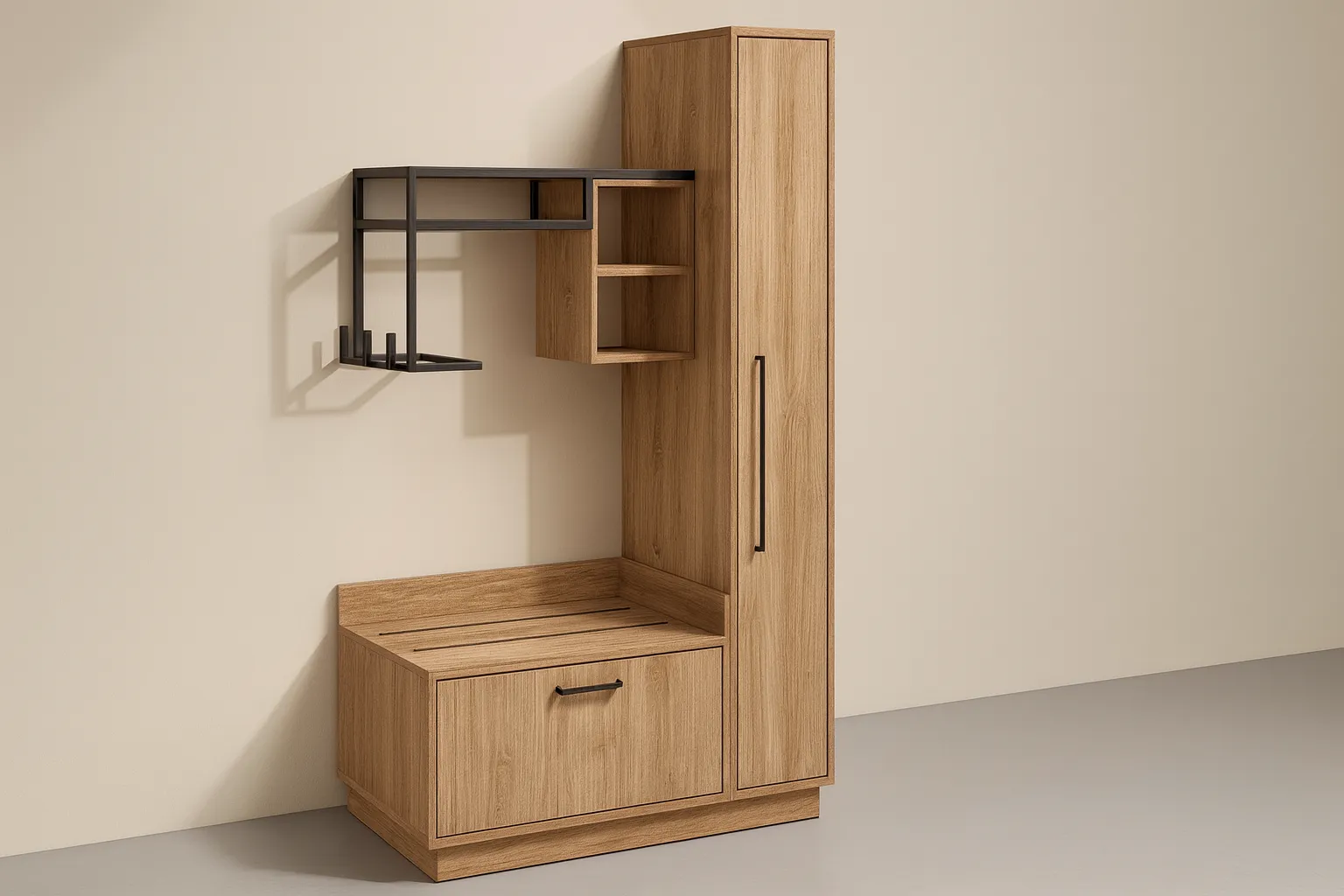 Sturdy and accessible, the luggage rack keeps bags within reach without taking up much space. Its straightforward design adds to the suite’s functional and tidy look.