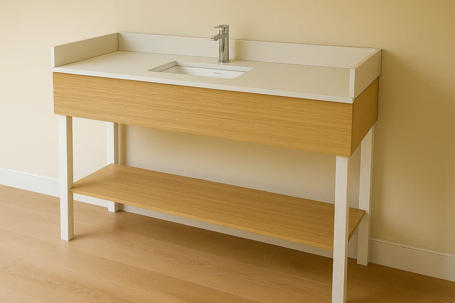 Seamless in intent and appearance, the vanity pairs clean surfaces with integrated function, a subtle centerpiece for effortless guest rituals.