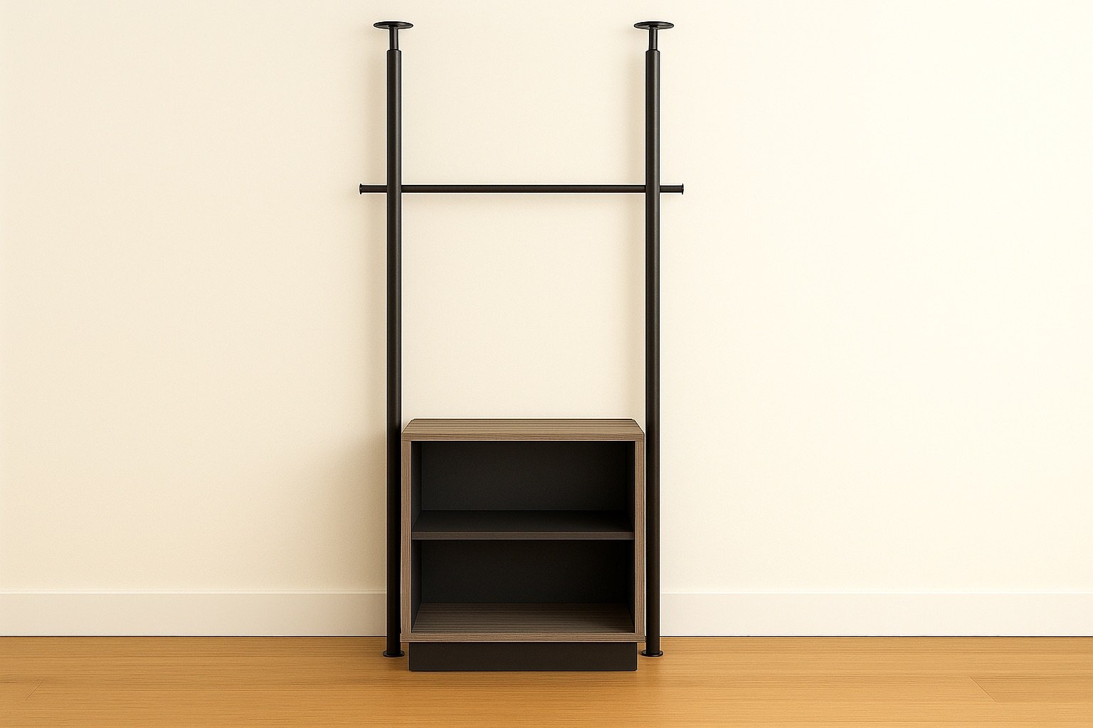 The wardrobe offers smart storage solutions with a clean, architectural presence, helping guests organize their stay with ease and style.