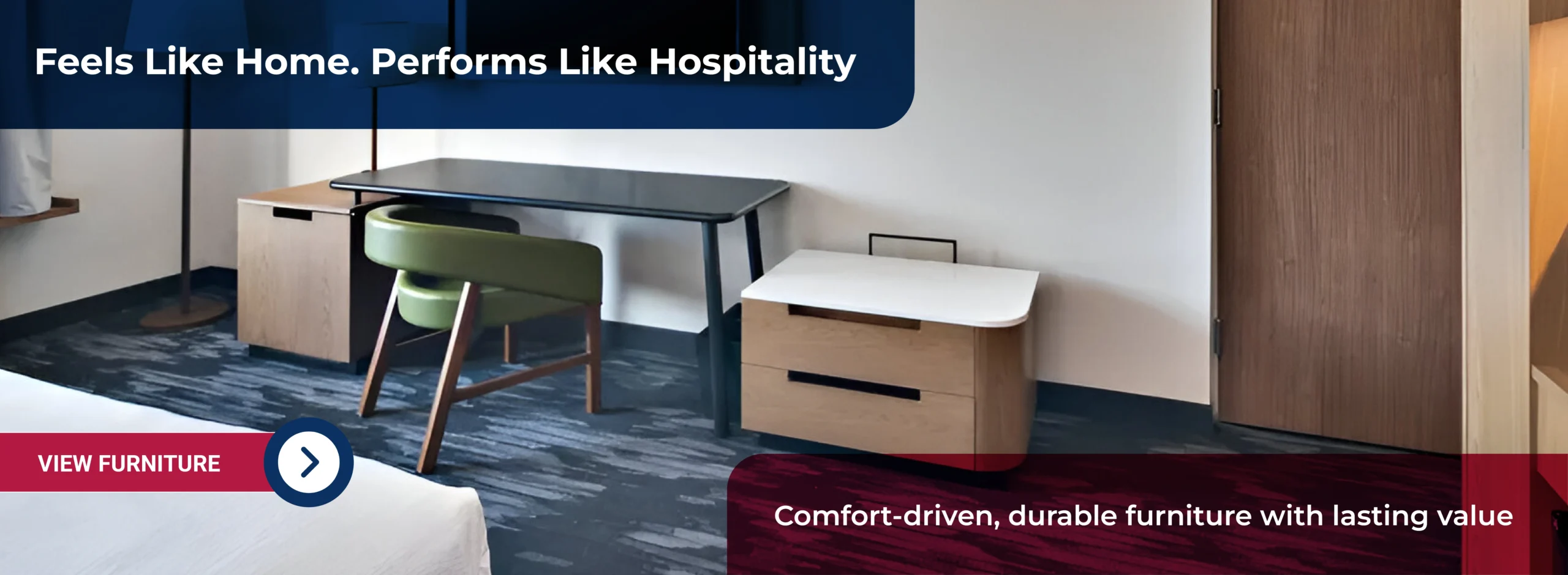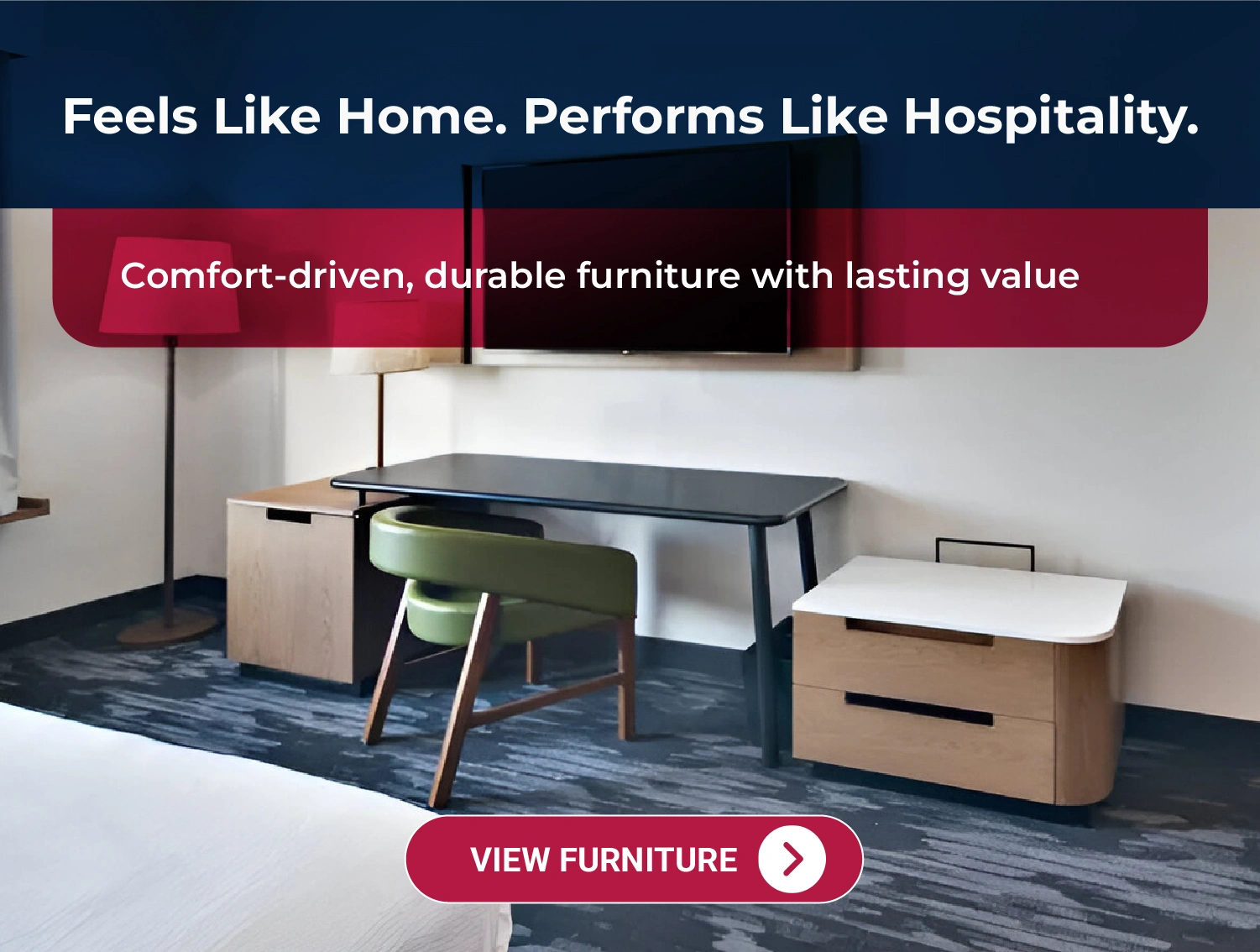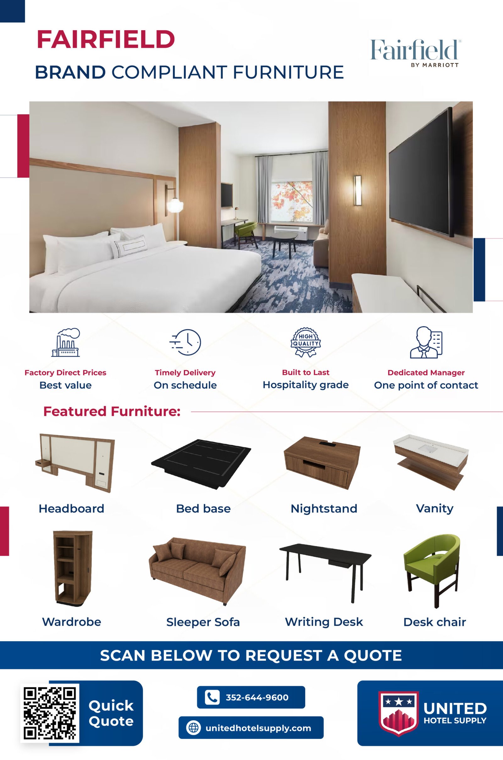 United Hotel Supply proudly partners with Fairfield by Marriott to create furniture solutions that reinforce the brand’s dedication to a home away from home experience. Inspired by simplicity, our furnishings embody Fairfield’s signature warmth and comfort, forming inviting spaces that blend practical function with refined style. Grounded in Marriott’s rich heritage and traditions, our custom-crafted pieces evoke comfort and familiarity, ensuring every guest enjoys a seamless and memorable stay.