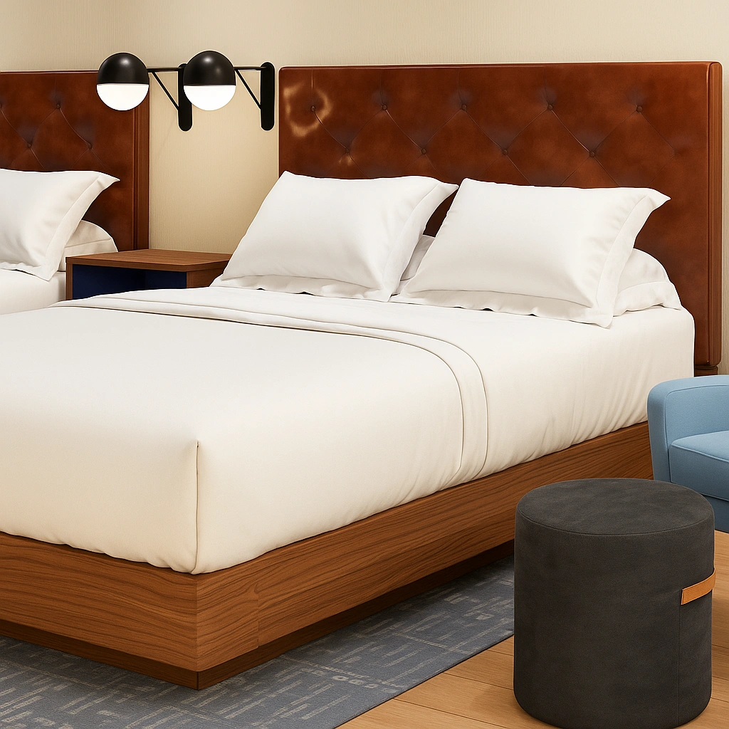 Solid and stable, the bed base combines durability with tailored simplicity, providing a reliable foundation for varied guest preferences.