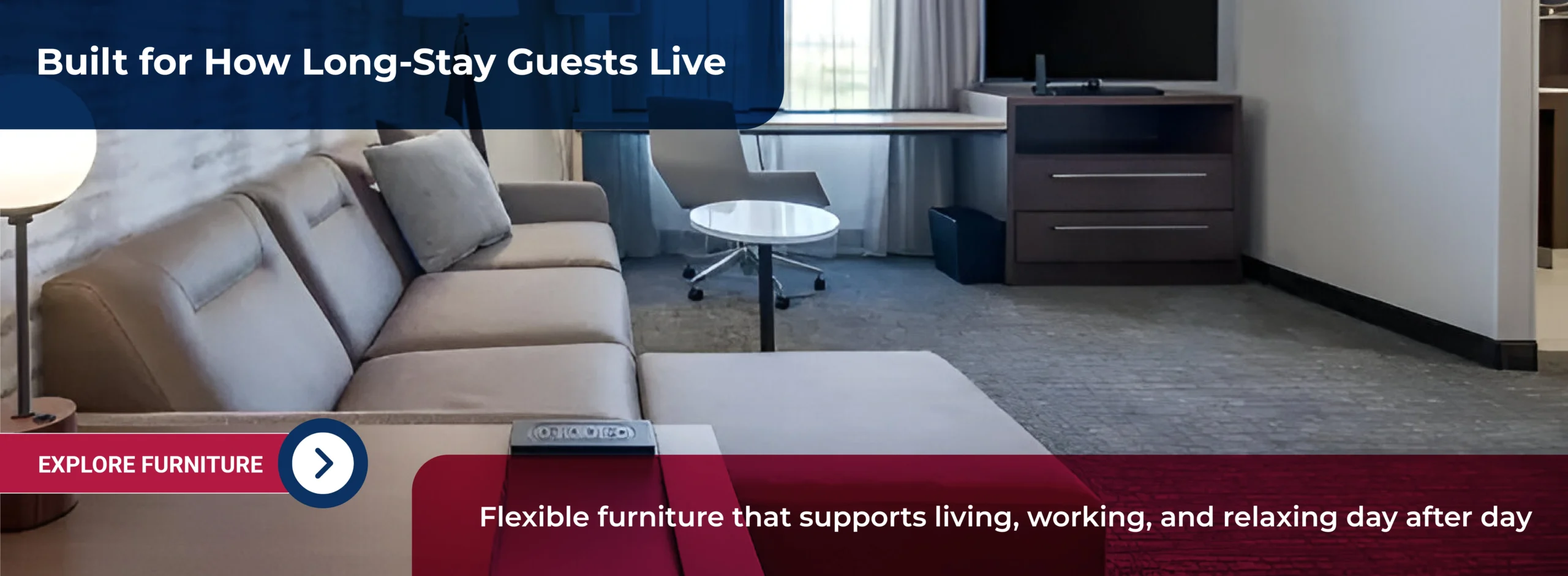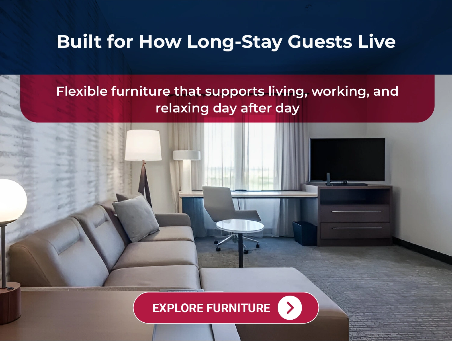 United Hotel Supply collaborates with Residence Inn by Marriott, the world’s leading extended-stay brand, to deliver furniture solutions designed for long-term comfort and flexibility. Our furnishings complement spacious suites that support how guests live, work, and relax during extended stays. Through warm, functional environments that unify living, working, and sleeping areas, we help reinforce Residence Inn’s commitment to enabling guests to travel independently while enjoying the comforts of home.