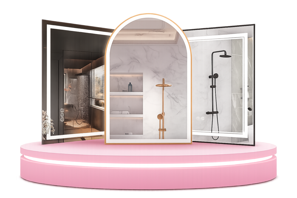 Hospitality-grade LED mirrors in stock and made to order. Custom shapes — oval, round, square and rectangle — any size. Dual strip LED, CCT adjustable, built-in defogger, shatterproof glass. UL & ETL listed. 3-year warranty.