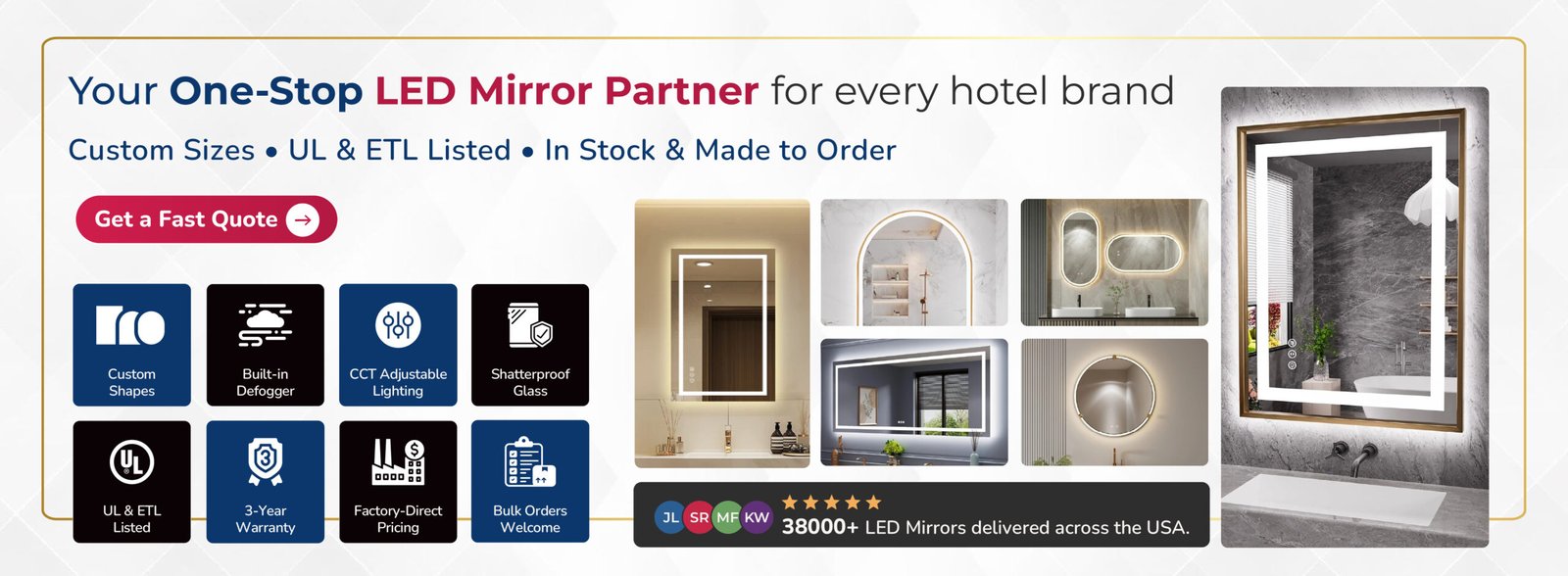 Custom sizes and shapes with no upcharge. Dual strip LED. CCT adjustable. Built-in defogger. Shatterproof glass. UL and ETL listed. 3-year warranty. Free shipping anywhere in the USA.