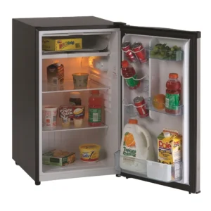 Energy Star rated. Environmentally friendly R600a refrigerant. Full width freezer section. Semi-automatic defrost. 1 full width and 1 – 1/2 width adjustable glass shelves. Integrated door shelving with tall bottle storage. CanStor® beverage dispenser. Mechanical thermostat. Integrated door handle. Reversible door hinge. Smooth back design. 32 11/16″ H x 17 11/16″ W x 18 8/16″ D.