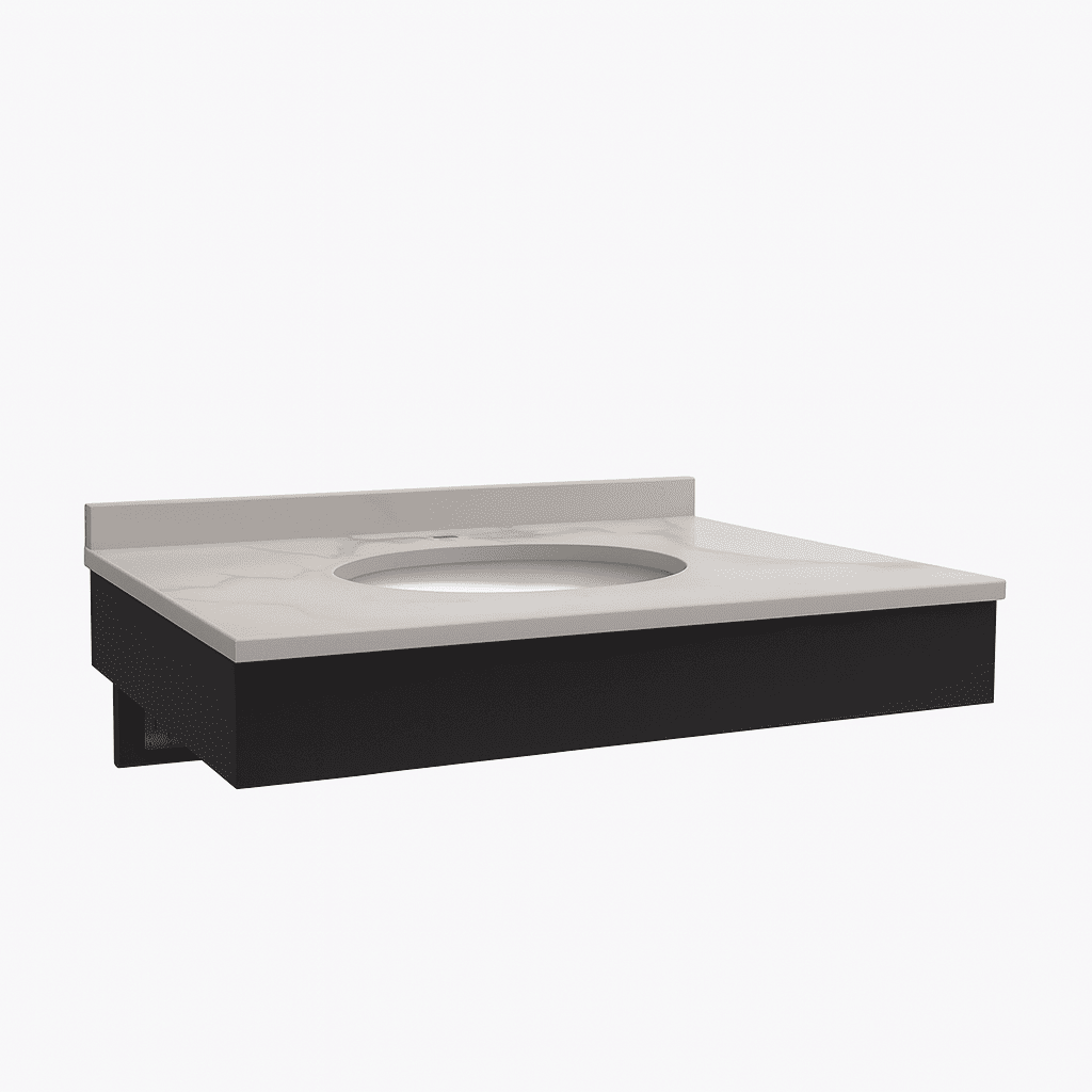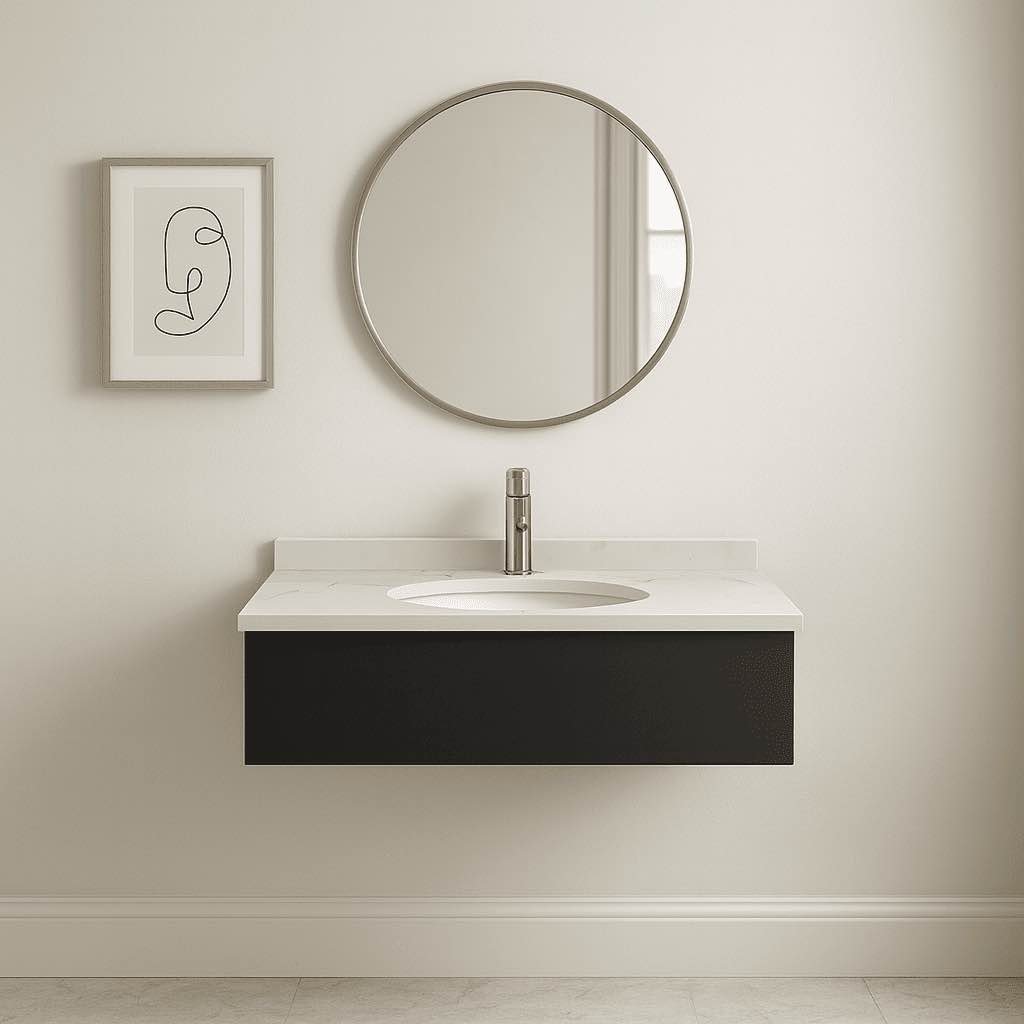 A compact wall-mounted vanity featuring a sleek dark base and a bright stone-look countertop—ideal for modern bathroom designs and space-efficient commercial layouts.