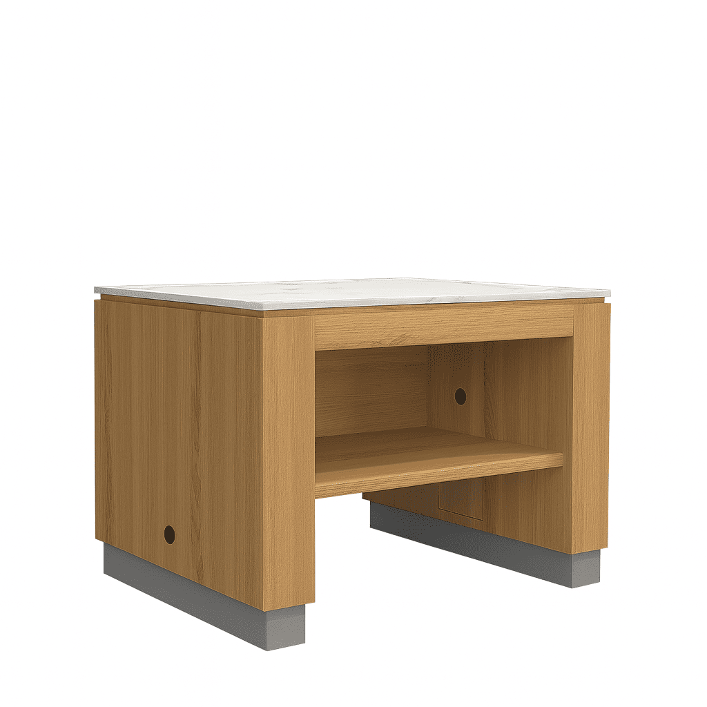A modern multifunction island featuring an open microwave shelf, durable wood construction, and a clean stone-look top—ideal for guest suites, kitchenette areas, and compact commercial spaces.