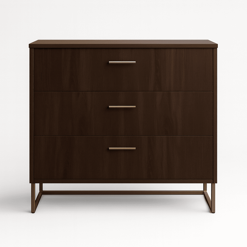 A contemporary dark-wood 3-drawer dresser with metal base and handles, designed for hotel guest rooms, suites, and premium hospitality spaces.
