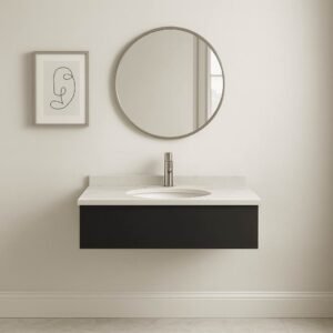 A modern, space-efficient trash and tray receptacle featuring a clean wood finish and concealed waste compartment—ideal for renovation projects requiring organized, guest-friendly refuse solutions.