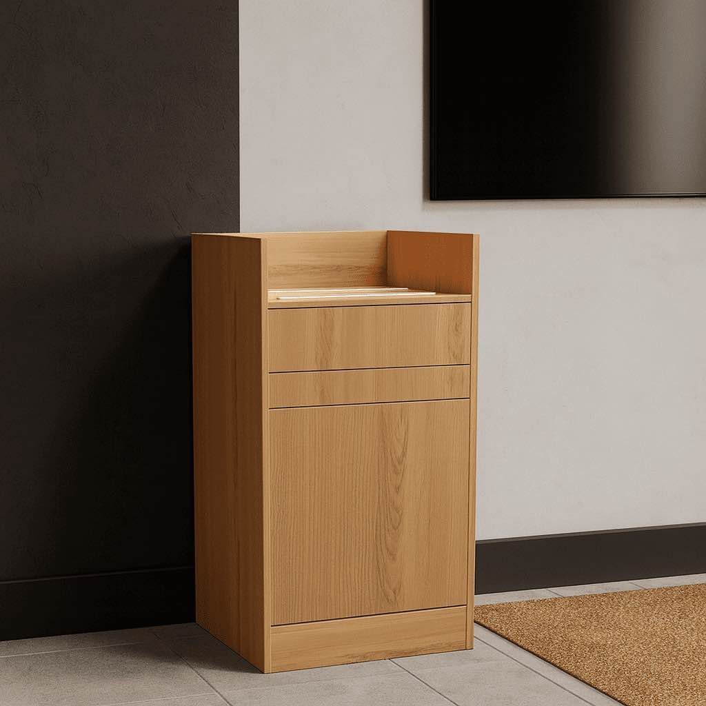 The raised upper tray shelf offers guests a convenient drop-off point, while the large lower compartment discreetly houses a waste bin or refuse container. Clean vertical lines, a natural wood finish, and a fully enclosed design create a polished appearance suitable for public corridors, breakfast areas, lounge spaces, or renovated service zones.