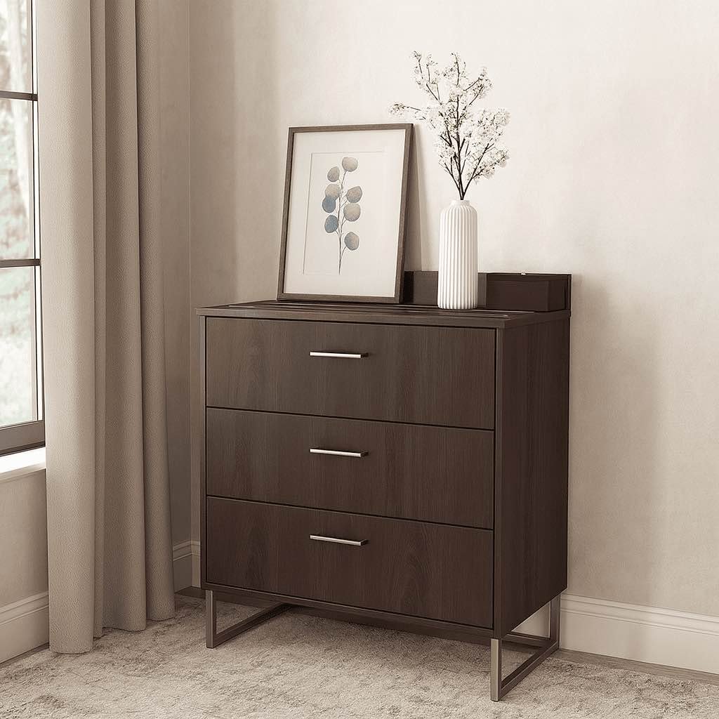 A modern medium-size dresser with a rich dark-wood finish, metal base, and three full-extension drawers—designed for stylish commercial interiors and guest-focused environments.
