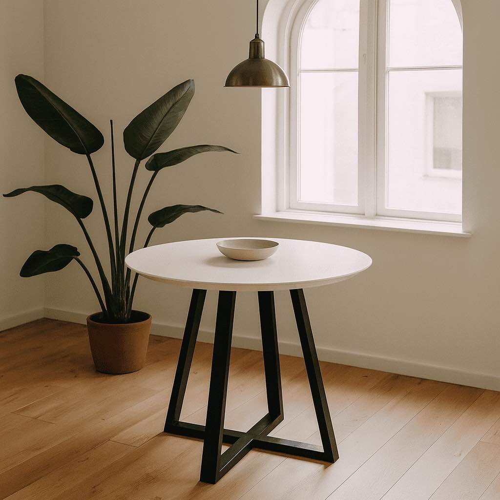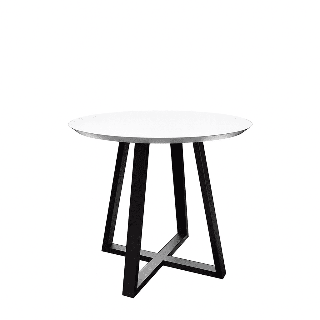 A modern round work table featuring a crisp white top and bold angular base—perfect for guest rooms, lounge areas, and contemporary commercial spaces.