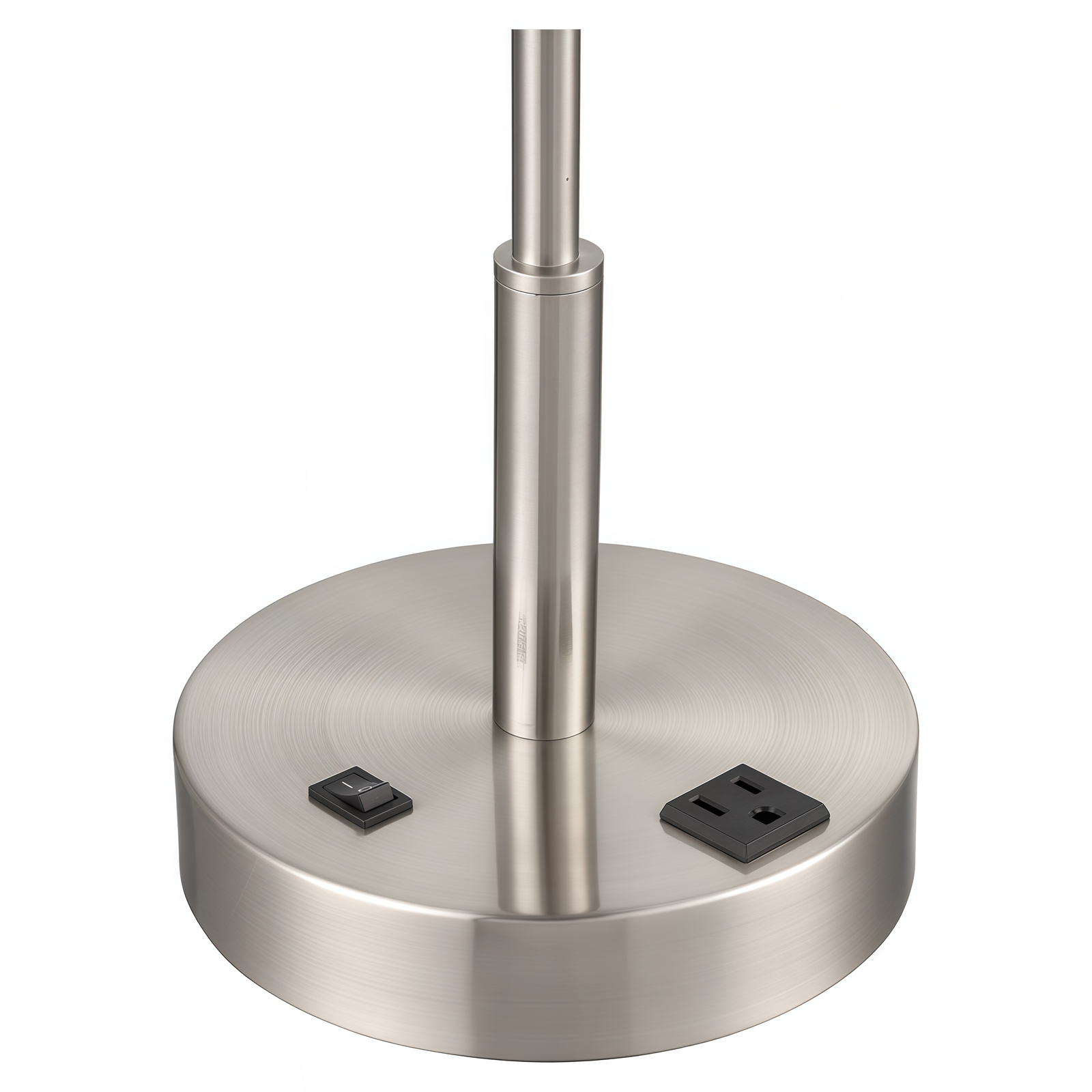 24.5″H Table lamp with brushed nickel finish and one convenience outlet
