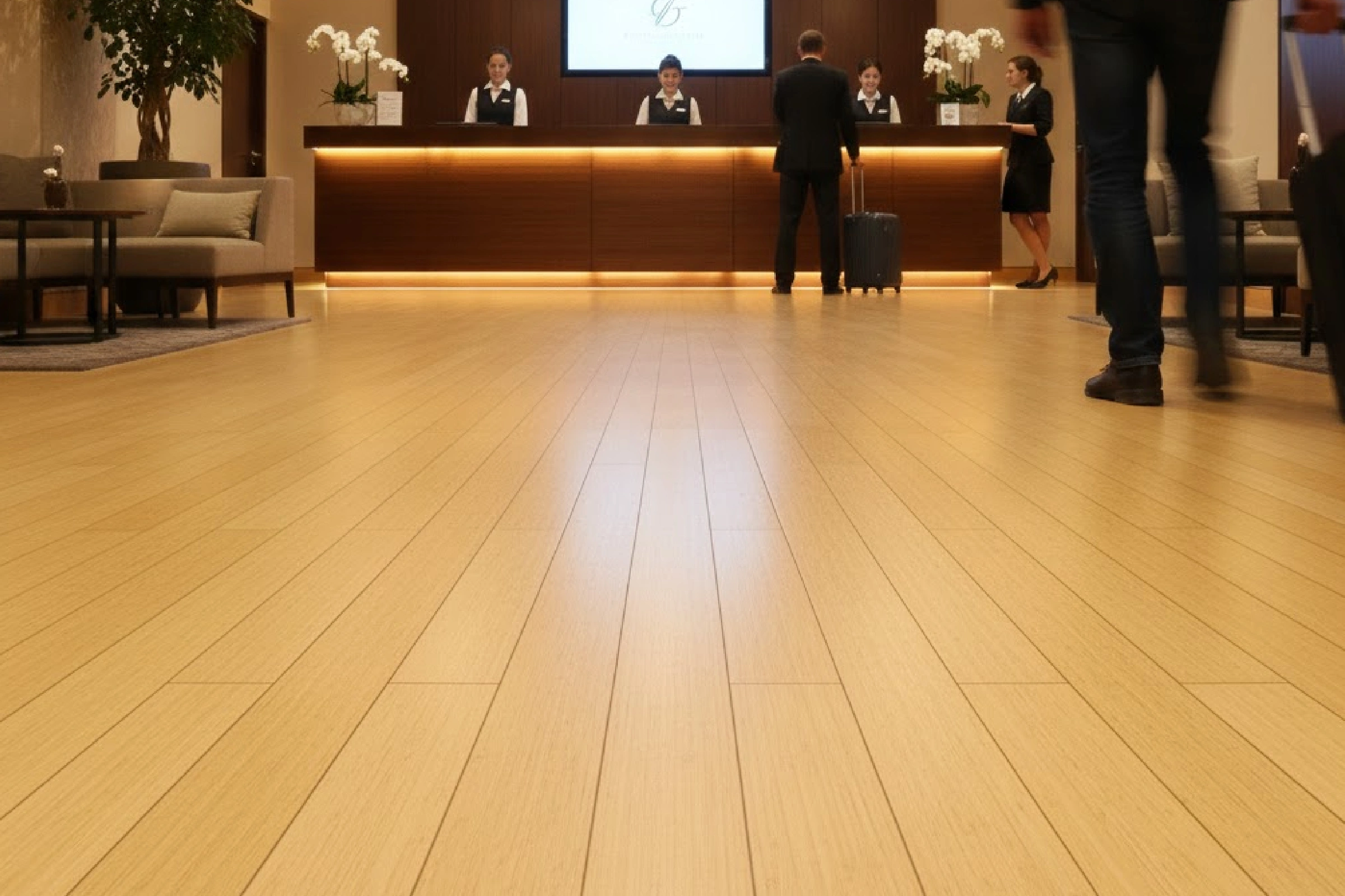 - Bamboo engineered flooring allows quick sweeping and mopping for hotel maintenance teams.