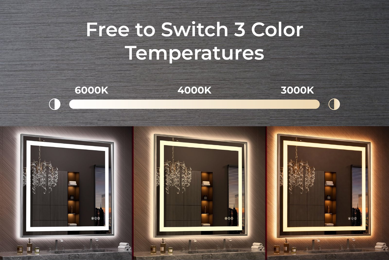 Enjoy crystal-clear reflection with front and back LED illumination, offering bright, even, and shadow-free lighting ideal for grooming, shaving, and makeup application. With 3 adjustable color temperatures (3000K Warm, 4500K Natural, 6500K Cool) and dimmable brightness, you can customize your lighting for the perfect ambiance at any time of day.