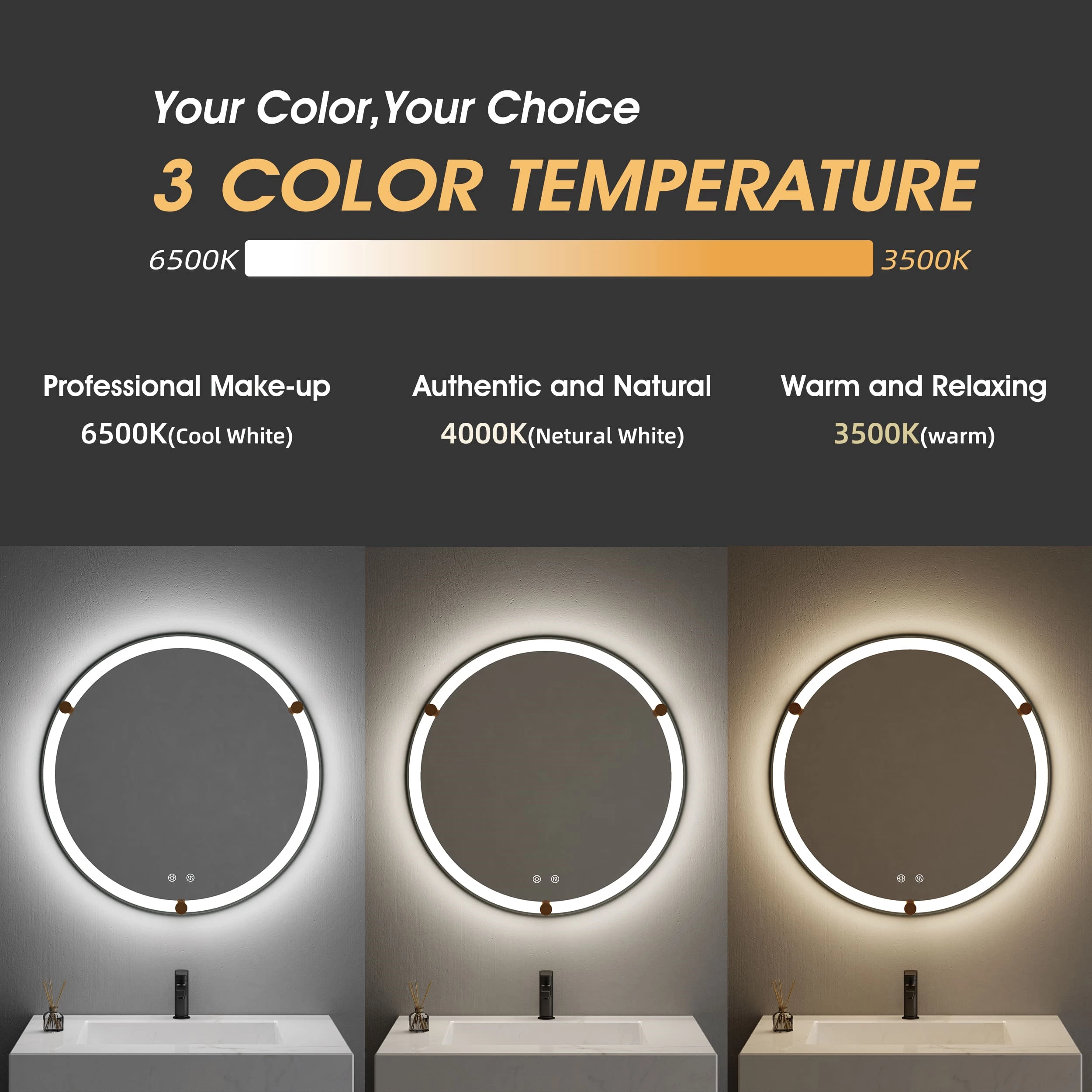 Enjoy crystal-clear reflection with front and back LED illumination, offering bright, even, and shadow-free lighting ideal for grooming, shaving, and makeup application. With 3 adjustable color temperatures (3000K Warm, 4500K Natural, 6500K Cool) and dimmable brightness, you can customize your lighting for the perfect ambiance at any time of day.