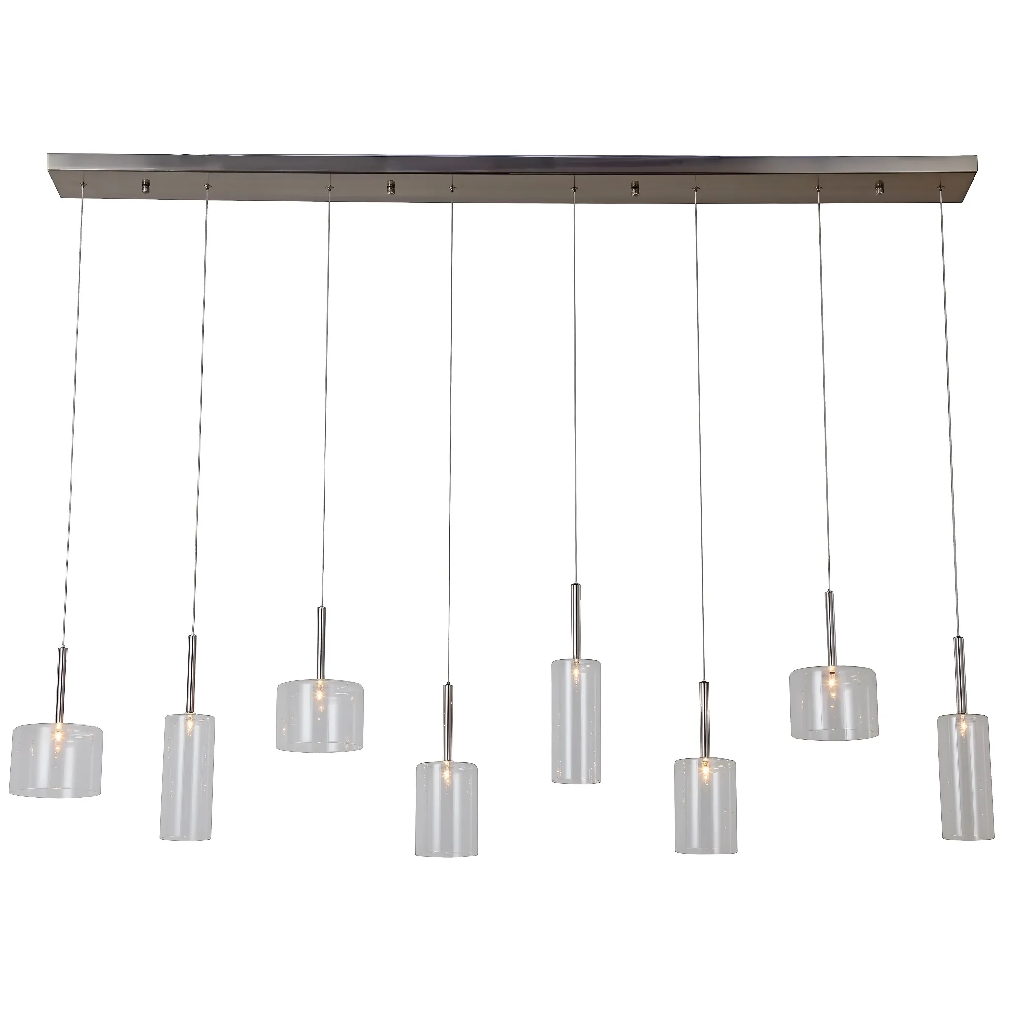 This 65-inch wide eight-light hanging ceiling fixture makes a striking statement with its contemporary brushed nickel finish and dynamic arrangement of assorted glass shade sizes. The varied glass shades create visual interest while delivering balanced, ambient illumination throughout the space. Designed to blend modern elegance with artistic flair, this fixture is ideal for dining areas, living rooms, or open-concept interiors. Its sleek metal framework and unique composition enhance both style and functionality, making it a captivating centerpiece for any room.