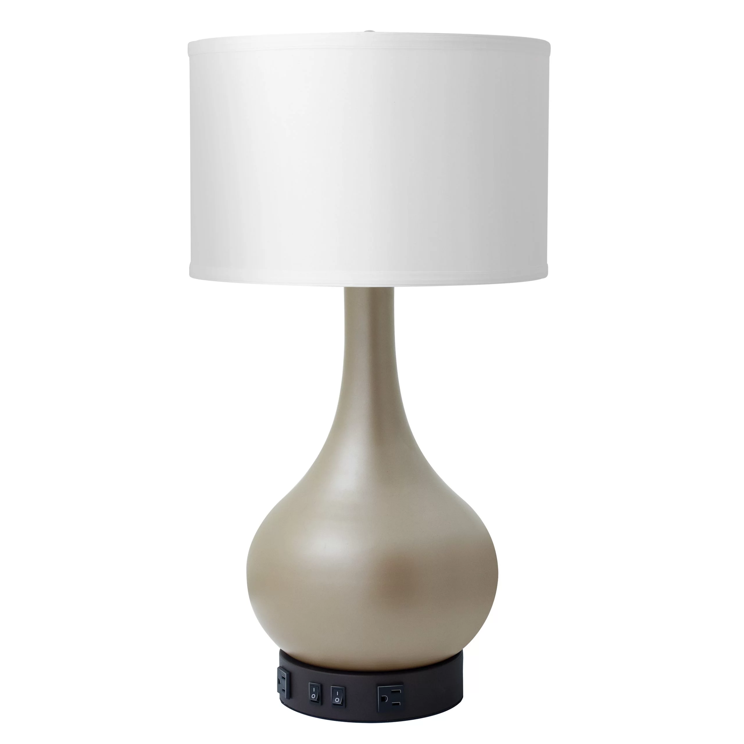 26″H Two light desk lamp with champagne finish, bronze base and two convenience outlets