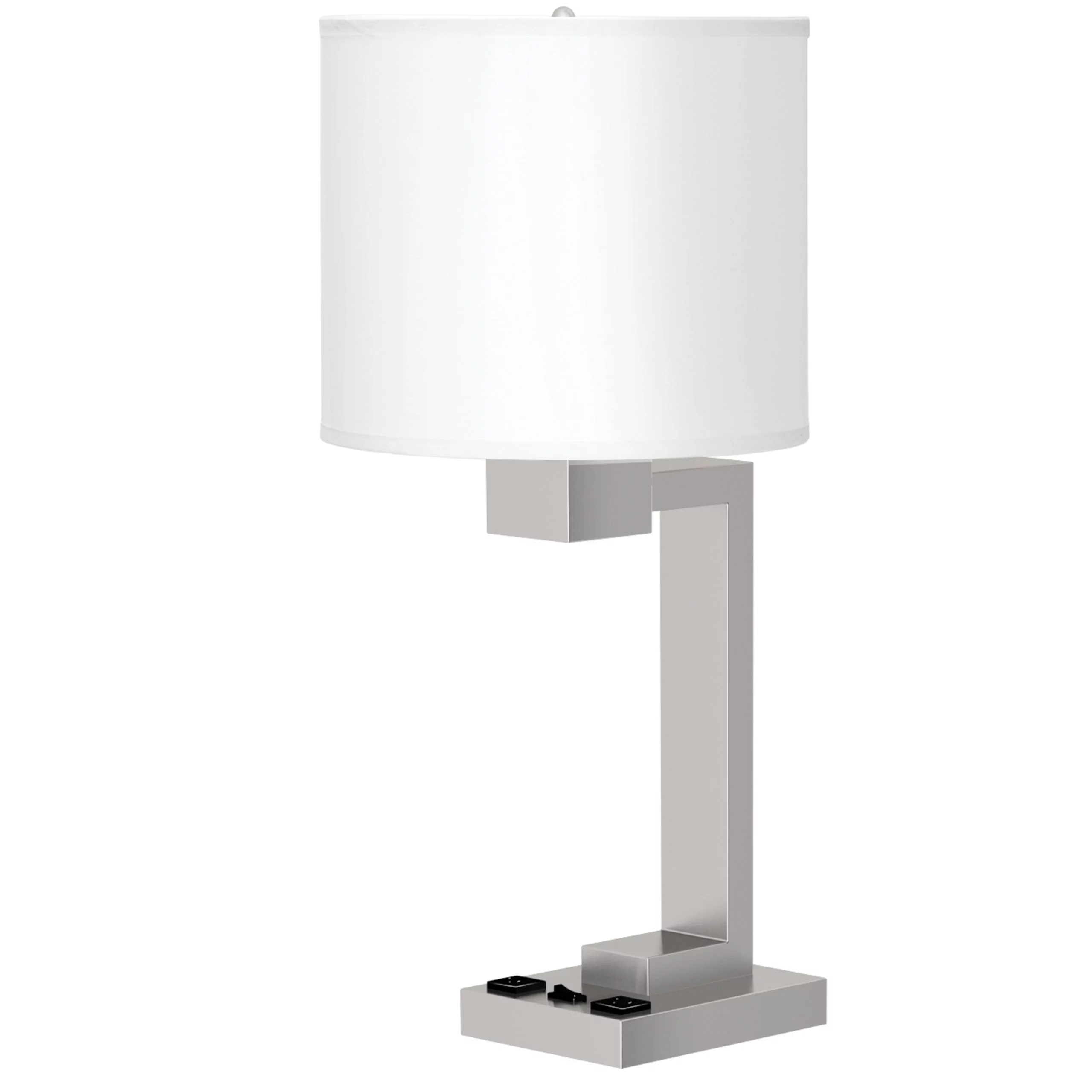 26″H Table lamp with brushed nickel finish and two convenience outlets