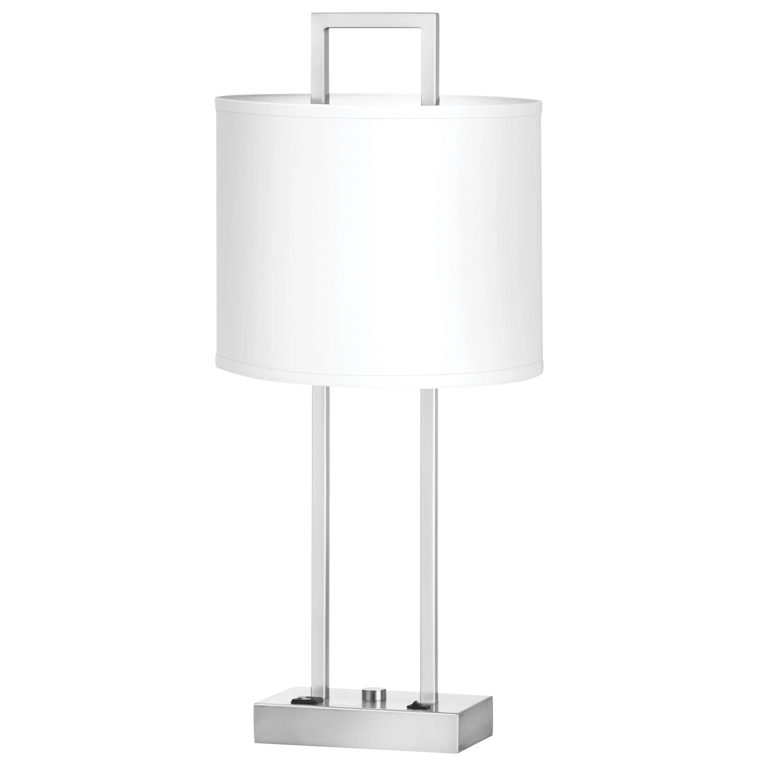 29″H Table lamp with brushed nickel finish and one convenience outlet