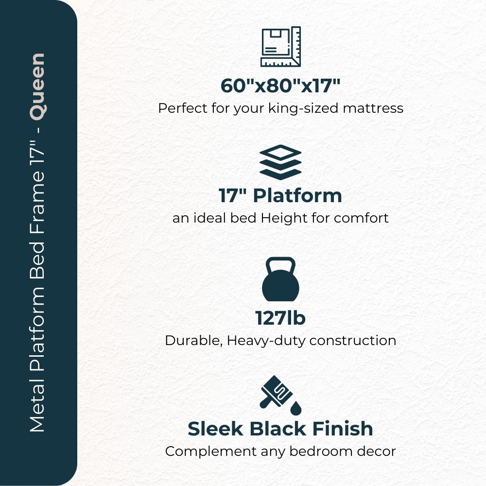 Upgrade your sleep setup with our 17″ Queen Platform Bed Frame—a perfect blend of style, strength, and simplicity. Designed with a sleek, modern look, this frame features a sturdy steel construction that provides exceptional durability and stability, supporting up to 3,000 lbs without the need for a box spring.