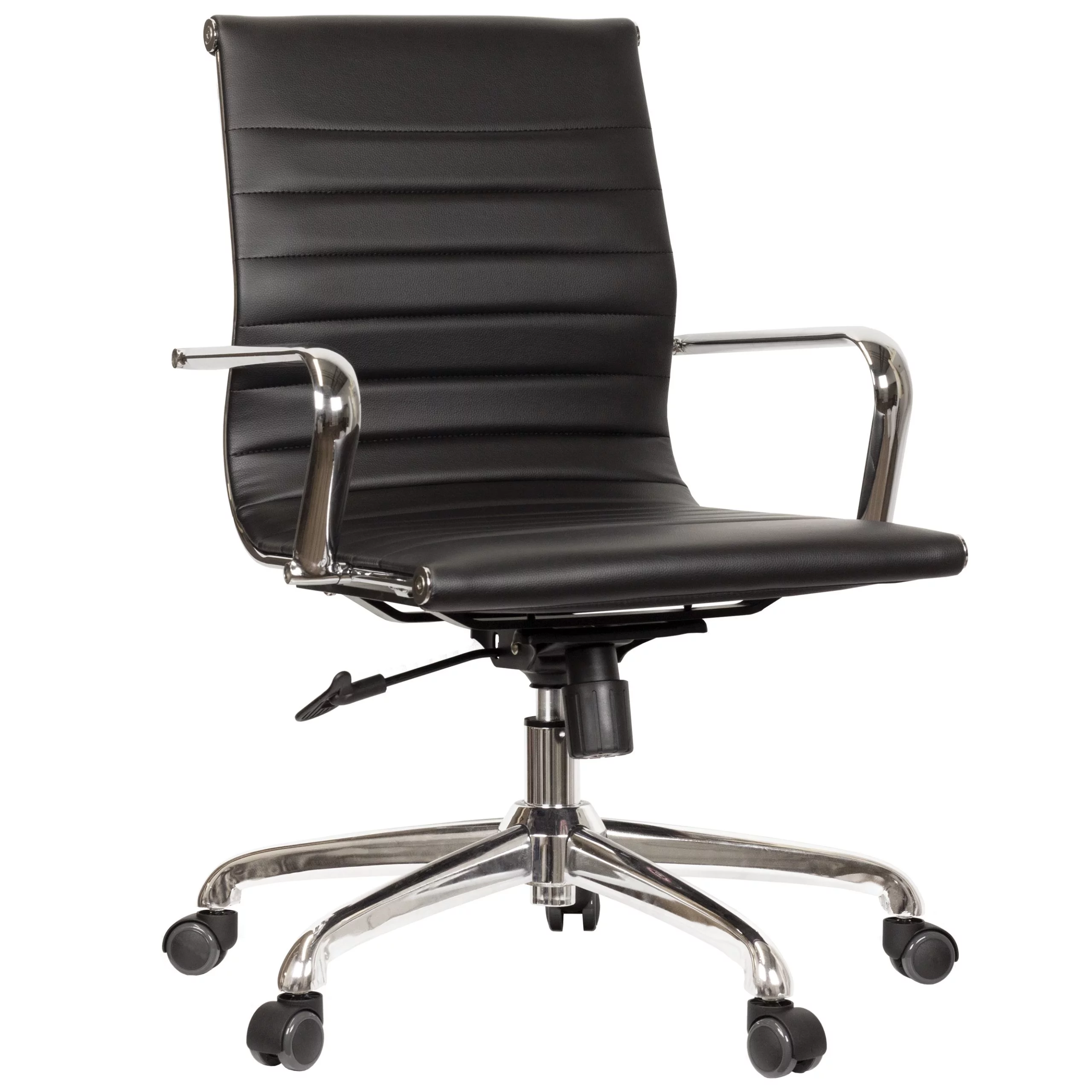 Black mid back, synthetic leather task chair with metal arms