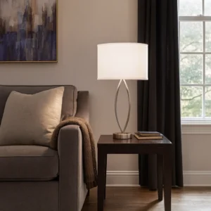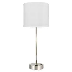 26″H Two light table lamp with brushed nickel finish, two convenience outlets and 24″ cord cover