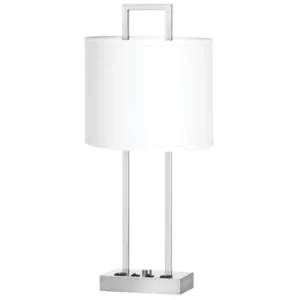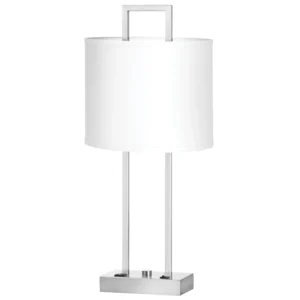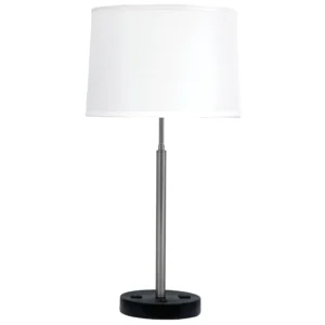 24.5″H Table lamp with brushed nickel finish and one convenience outlet
