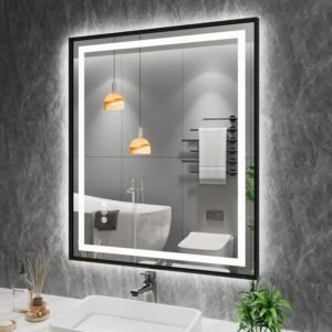 United Black Metal Frame Four-Sided LED Bathroom Mirror – Front & Back Lit, Dimmable, Inbuilt Defogger, 3-in-1 CCT Lighting – 30″W × 36″H