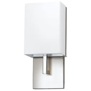 13″H Wall sconce with brushed nickel finish and frosted acrylic shade